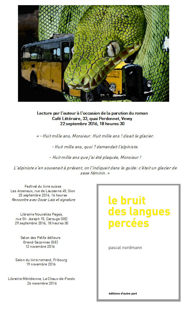 Atelier d'écriture électronique appuyé sur le moteur de l'Encyclopédie Mutante. Animé par Pascal NORDMANN, à l’occasion de la fête des 10 ans de Saute-frontière Aucune connaissance en programmation n'est nécessaire. Maison de la poésie transjurassienne 11 DÉCEMBRE 2011 11H30 - 17H Salle communale de CINQUÉTRAL Apéro-poétique remise du prix du concours Dix mots, dis-moi, dix ans, buffet jurassien et intermèdes musicaux et vocaux Avec les auteurs Françoise MONNERET, Jacques MOULIN, Maryse VUILLERMET Comédiens Muriel RACINE, Daniel VOUILLAMOZ, Pascal NORDMANN Voix et contrebasse Françoise MONNERET et Jean BOLCATO 17, Grande Rue – Cinquétral - 39200 Saint-Claude – 03 84 45 18 47 - (Jura français, une heure de Genève) sautefrontiere | |||