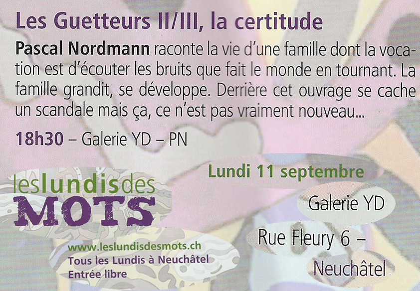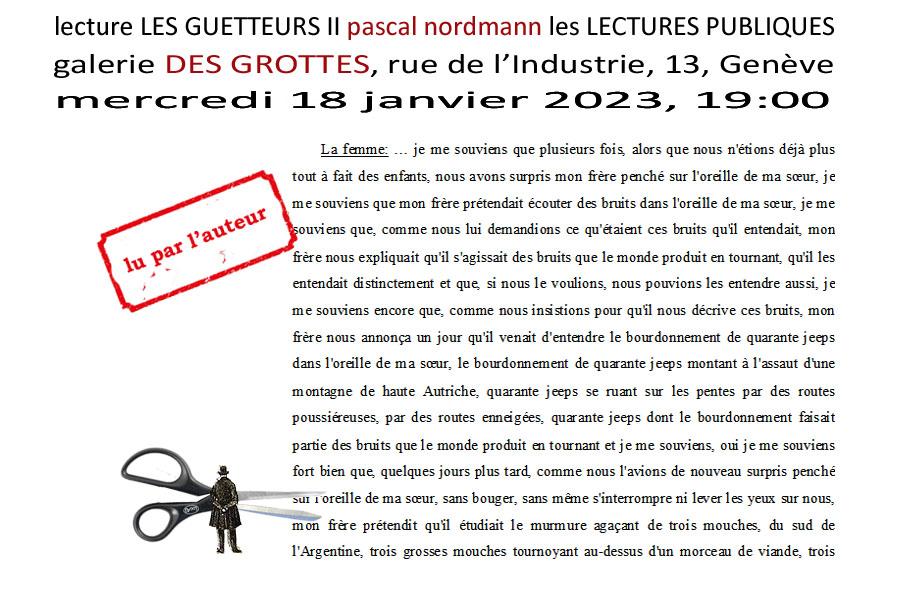 Pascal Nordmann lit à onze spectateurs successivement un extrait de cinq minutes des Guetteurs III (L'hésitation) dans une petite salle spécialement construite